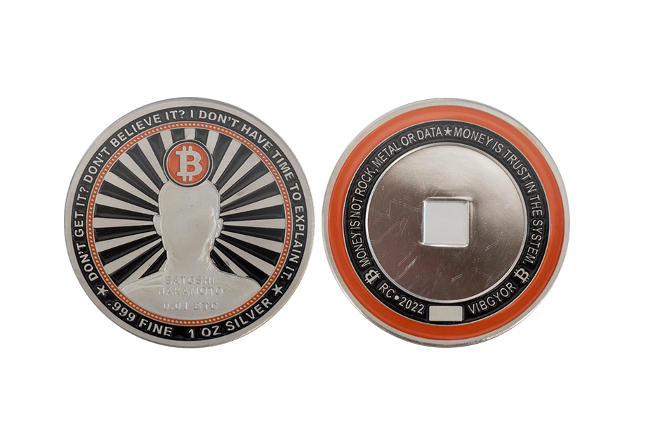PN31670_999 Fine silver custom coins in polished plate_soft enamel highlights_engraving field for serial numbers